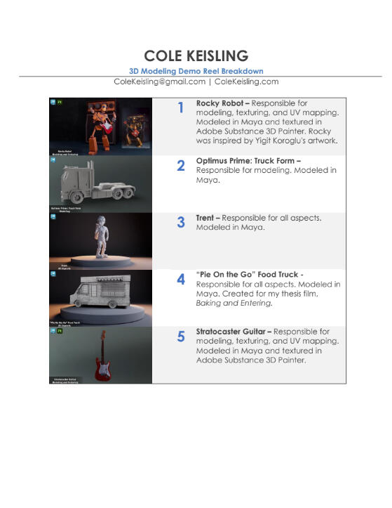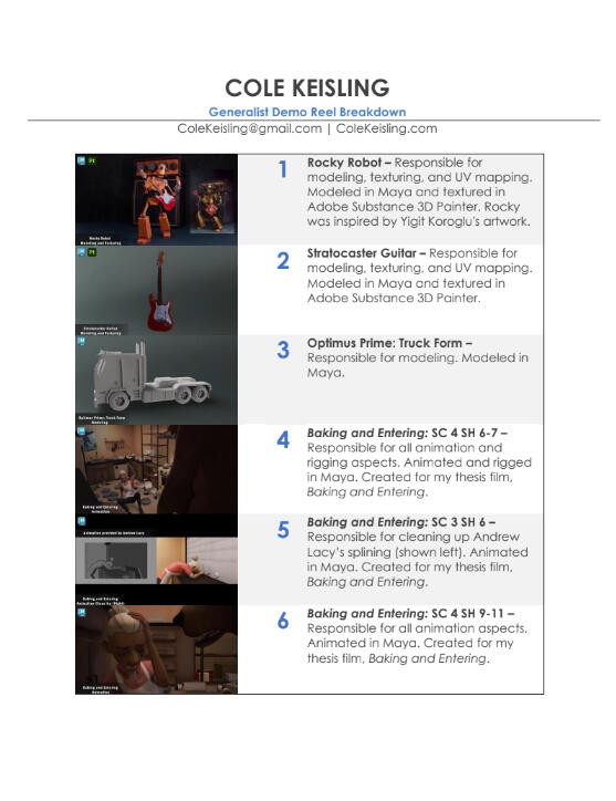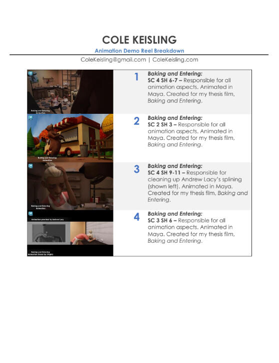 My name is Cole Keisling, I'm a CG Generalist with a B.S. in Animation and a minor in Art. I'm currently studying at AnimSchool under the 3D Character Program.I directed my thesis film, Baking and Entering, a three-minute animated short. During production, I created various hard surface models, designed and rigged the film's antagonist, animated numerous shots, and assisted with scheduling and documentation. For more information about the film, please visit my Baking and Entering Project Blog.